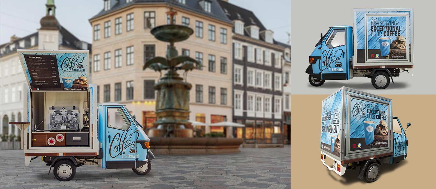 Bilfoliering af kaffescooter, med eftermonteret folietekster og logos.